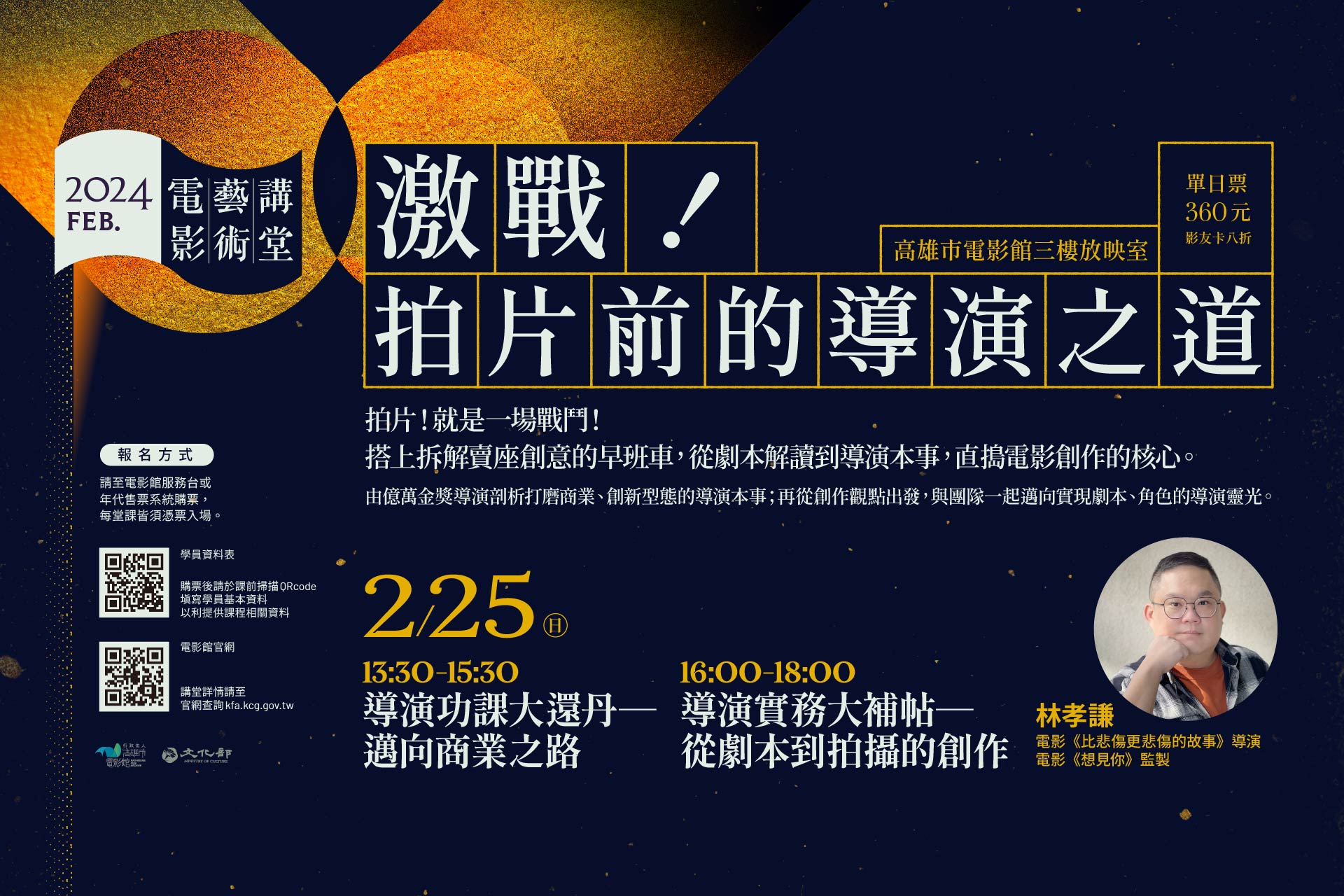 本次講座林孝謙導演將以自身的創作經驗,綜論導演之路的必修課。從前期的題材開發、劇本寫作時的創意思考到後製剪輯對故事的再次翻玩;如何與演員合作完整角色及表演?如何有效的與主創人員溝通?逐步揭示導演在面對眾多「取捨」時,內心最重要的價值觀。同時亦將引領學員跨越全球的商業市場,探討如何以導演的角色與世界的影視工作者接軌。在四小時課程中不藏私的帶你走向賣座創意的核心。