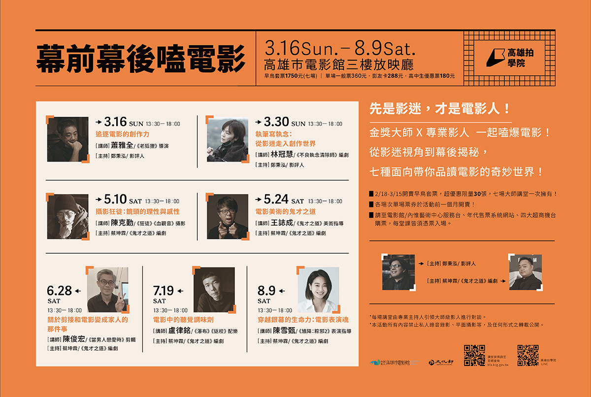 金獎大師喜歡什麼樣的電影?從電影人眼中看到的電影是否別有風味?今年高雄拍學院邀請7位重量級大師,由專業影人引領大師對談,帶領大家從「導演」、「編劇」、「攝影」、「美術」、「剪接」、「配樂」及「表演」視角感受光影藝術的無限魅力。與創作者一同品讀電影世界的奇妙與深度!