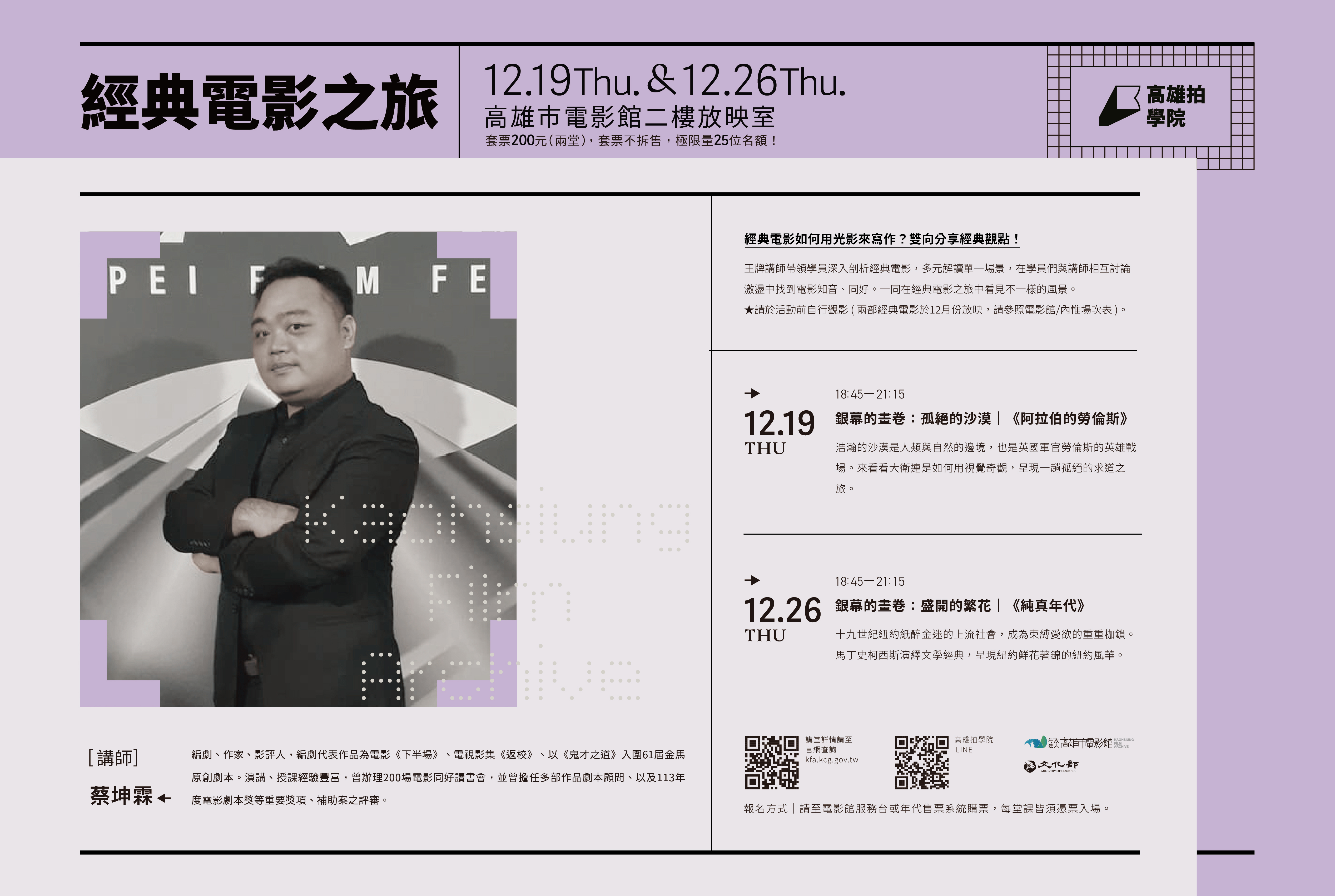 - 報名請至高雄市電影館1F服務台、年代售票網站(郵寄、便利商店取票)、四大超商機台購票,或是線上購票,每堂課皆須憑票入場,票券遺失恕不補發,請妥善保管 。