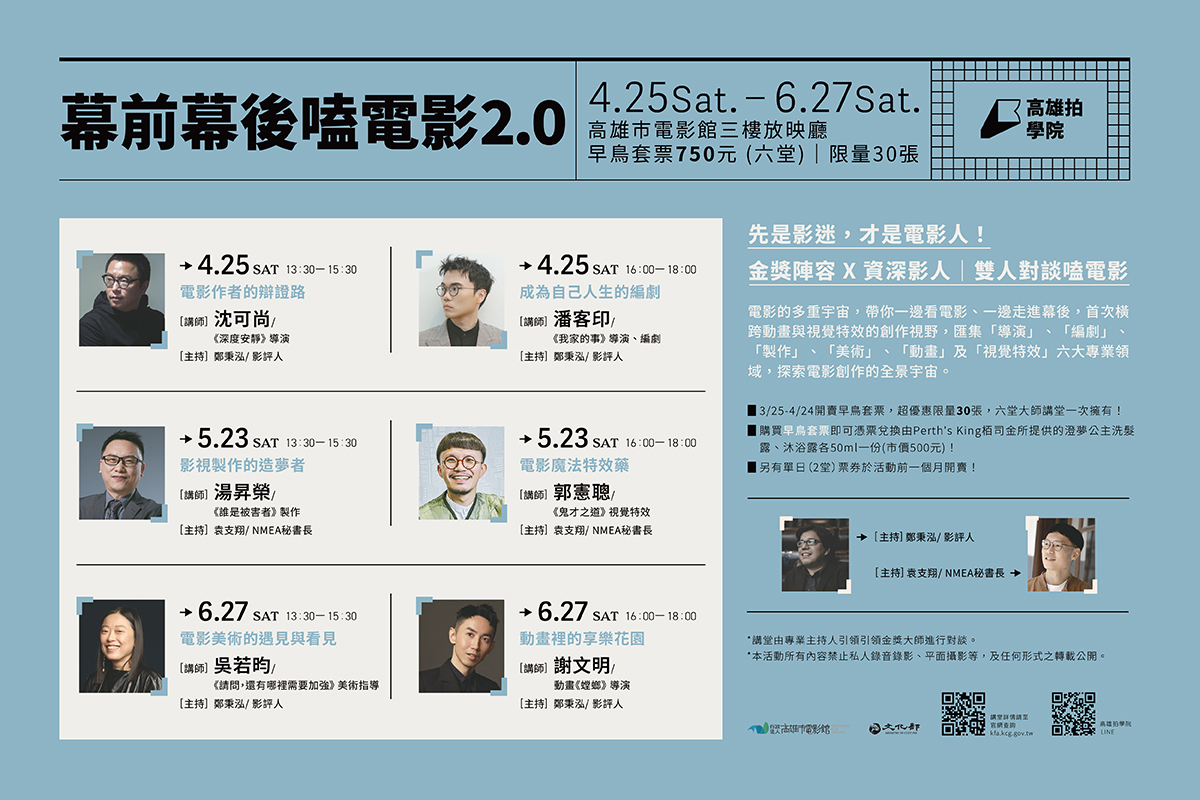 - 早鳥優惠套票退票須於4/24(五)20:00前至高雄市電影館1F服務台持票券及課程卡臨櫃辦理,並酌收票面金額10%之手續費,逾期恕不接受退票。