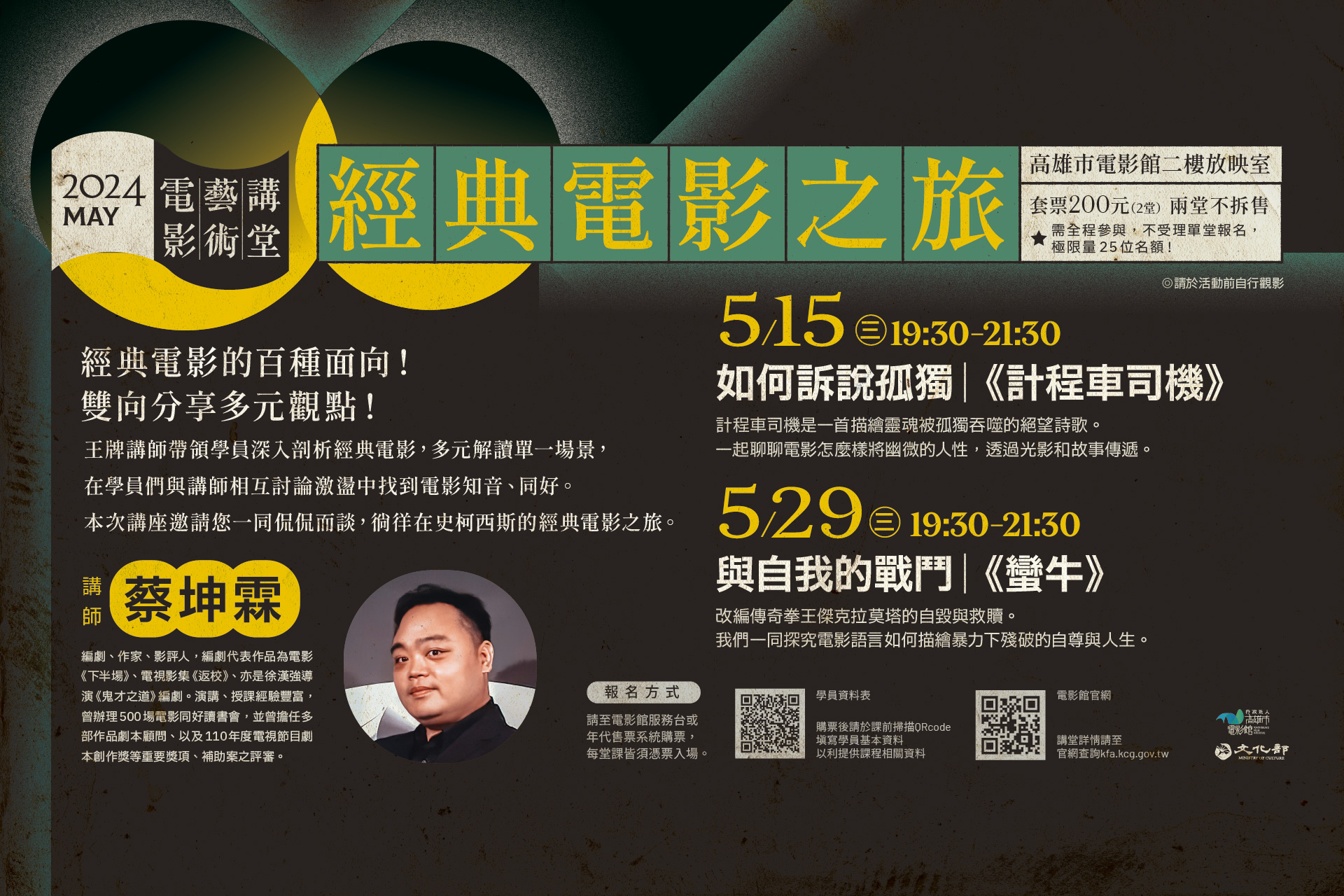 編劇、作家、影評蔡坤霖,編劇代表作品為電影《下半場》、電視影集《返校》、亦是徐漢強導演《鬼才之道》編劇。演講、授課經驗豐富,曾辦理500場電影同好讀書會,並曾擔任多部作品劇本顧問、以及110年度電視節目劇本創作獎等重要獎項、補助案之評審。